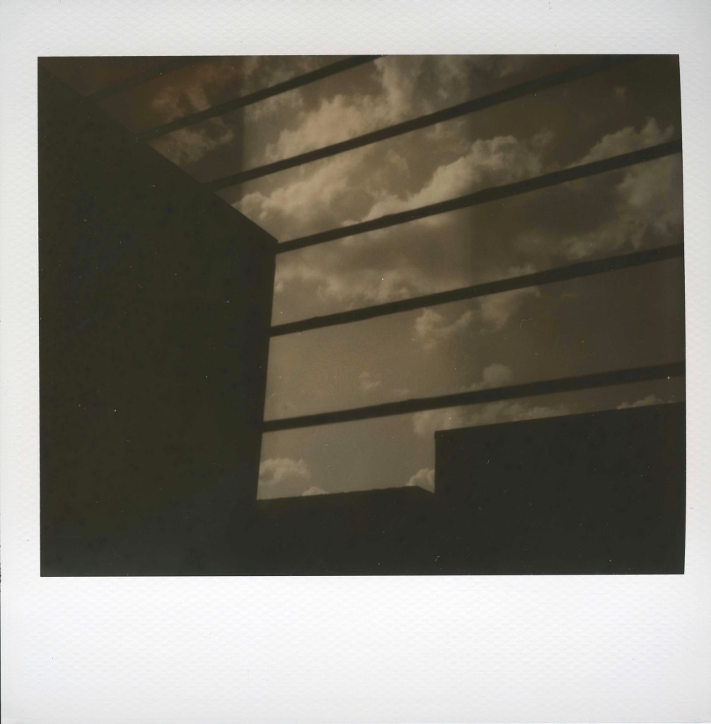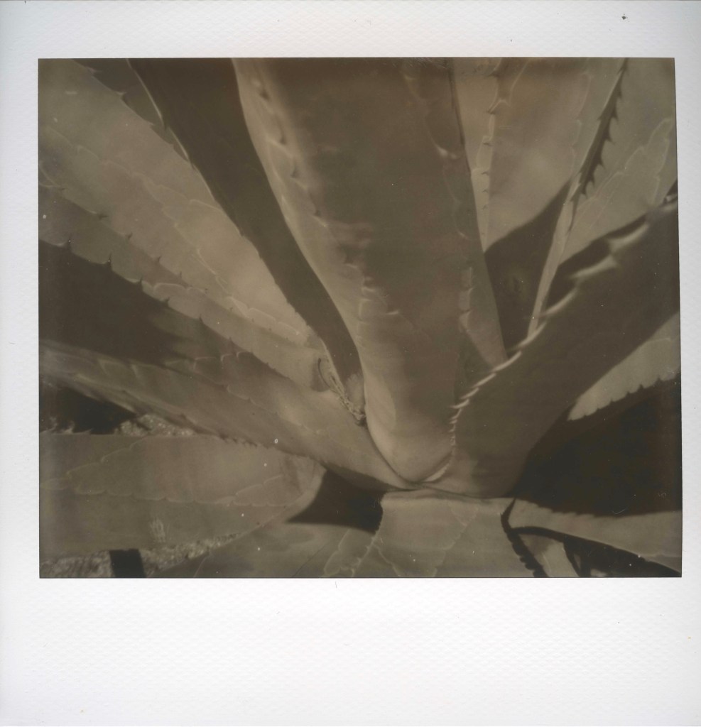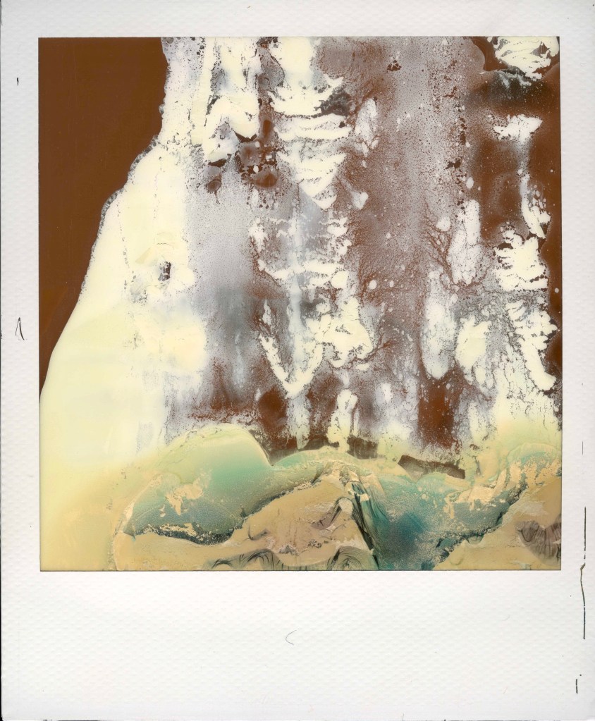 Unpredictable results are guaranteed when shooting Polaroid. I sometimes get a frame like this one where the chemical pack has dried out and when it ejects, spreads dry developing chemicals across the frame. I especially like this one. It reminds me of an overhead view of a sandy beach with a wave receding back into the cool blue water.